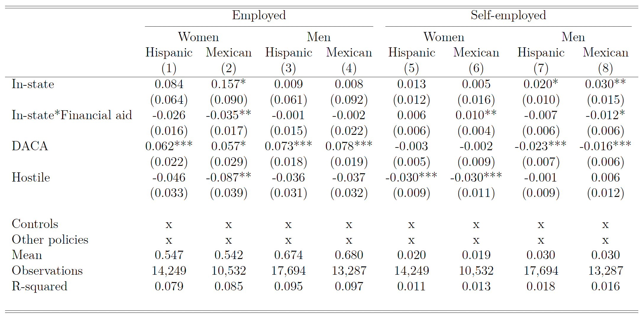 Notes: The variable of interest is InState which equals one if the state allows undocumented immigrants access to in-state tuition rates (see Table 1). Some states also offer access to FinancialAid. DACA equals one if the respondent is likely eligible. Hostile equals one if a state made it more difficult for the undocumented to enroll in college. All models include a constant term and controls specified in Appendix Tables A.8 and A.9, as well as state and year fixed effects. * p<0.10; ** p<0.05; *** p<0.01. All regressions are weighted using ACS person weights. Robust standard errors clustered at the state level are in parentheses.