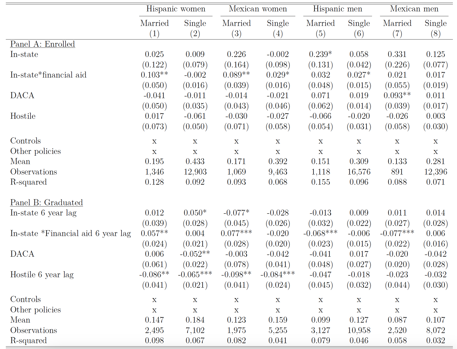 In this section, we further stratify our samples by marital status and estimate the in-state tuition policy effect on the same four outcomes. The results for college enrollment and graduation with AA degree are presented in Table 7. Panel A highlights the differences in current enrollment, and Panel B in the completion of a college degree. Interestingly, married men are more likely to be enrolled in states with generous tuition policies. Adding access to financial aid increases enrollment among all married women, single Mexican women, and single Mexican men. Married Mexican men’s enrollment increases with DACA eligibility. Panel B shows that single women are driving the increase in graduation rates. Women are less likely to graduate in states with hostile policies.