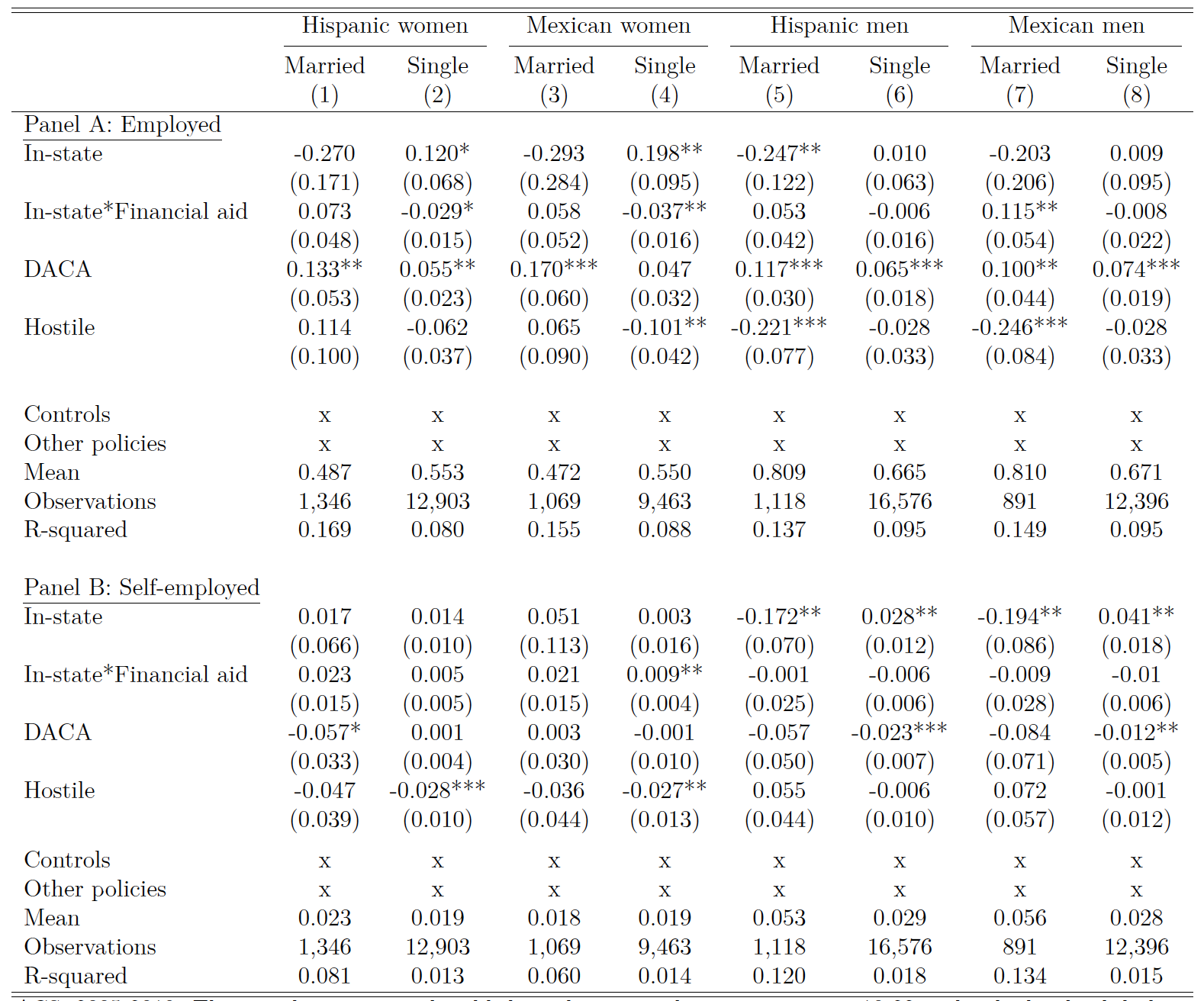Turning to the impact of in-state tuition access on simultaneous employment, we assess the degree of labor market attachment among the eligible likely undocumented youth. In our pooled sample, we find no impact on employment but document a significant increase in self-employment for Hispanic youth. Our gendered results indicate that Mexican women are more likely to be employed; this is driven by single women. The employment of single men is not responsive to in-state tuition. Moreover, we find evidence that lower-cost education encourages self-employment among men. Our results also highlight the varied responses by individuals from different countries of origin. Married Hispanic men are less likely to be employed when in-state policy is in place, but married Mexican men increase employment rates when they have additional access to financial aid. This is a fertile area for future research.