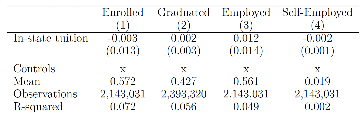 Table 4. The impact of in-state college tuition policies: employment outcomes
