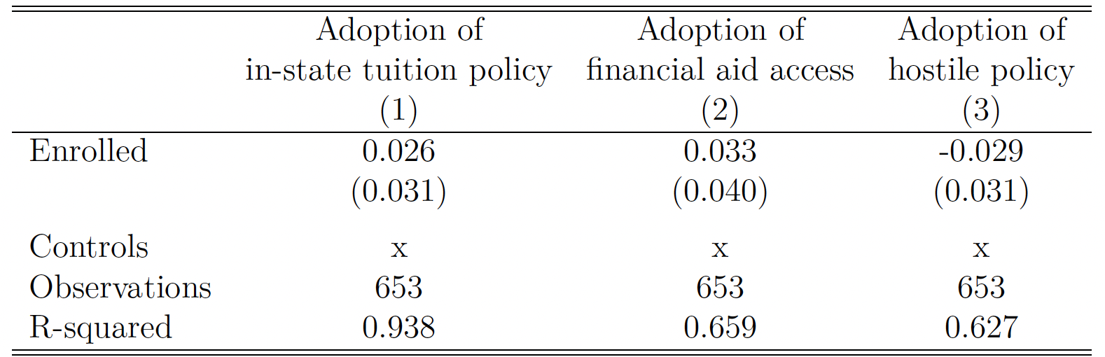 Next, in Table 10, we address the possibility of reverse causality; i.e., the possibility that the rate of college attendance by the likely undocumented prompted a state to implement the policy. To do so, we collapse the data to the state-year level and regress the adoption of in-state tuition access (column 1), adoption of access to financial aid (column 2), and adoption of hostile policies (column 3) on the share of the sample enrolled in college (Panel A) and on the share ever enrolled (Panel B). None of the coefficients predict the adoption of the policies, alleviating concerns of reverse causality.