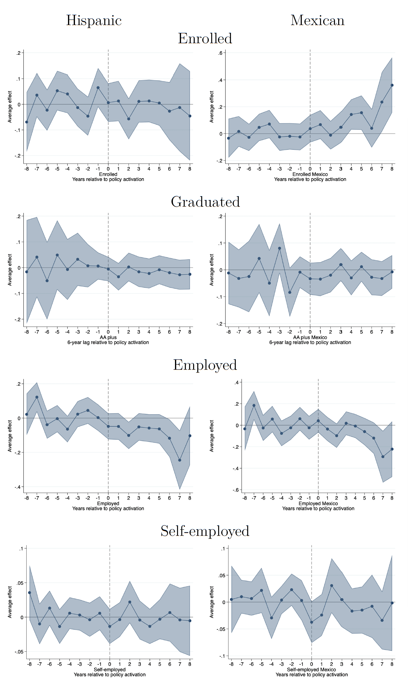 Overall, our findings thus far indicate that while in-state tuition access does not differentially impact women in terms of enrolling in a college class, it does provide a large enough incentive to continue and complete an AA degree. Among men, we observe a relatively large increase in enrolling in college classes, though they do not continue the pursuit of a degree. In terms of employment, in-state tuition access encourages employment among Mexican women, and self-employment among all men. DACA eligibility is not associated with higher enrollment rates but it plays an important role in employment outcomes increasing the likelihood of employment, and decreasing the likelihood of self-employment among men.