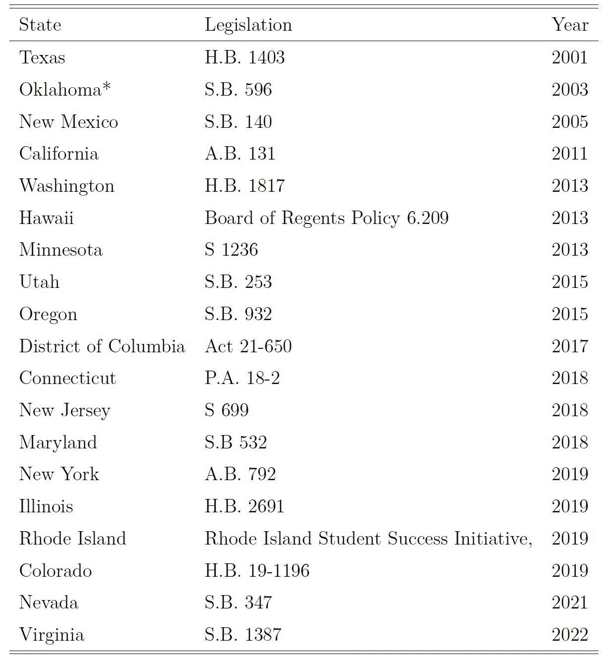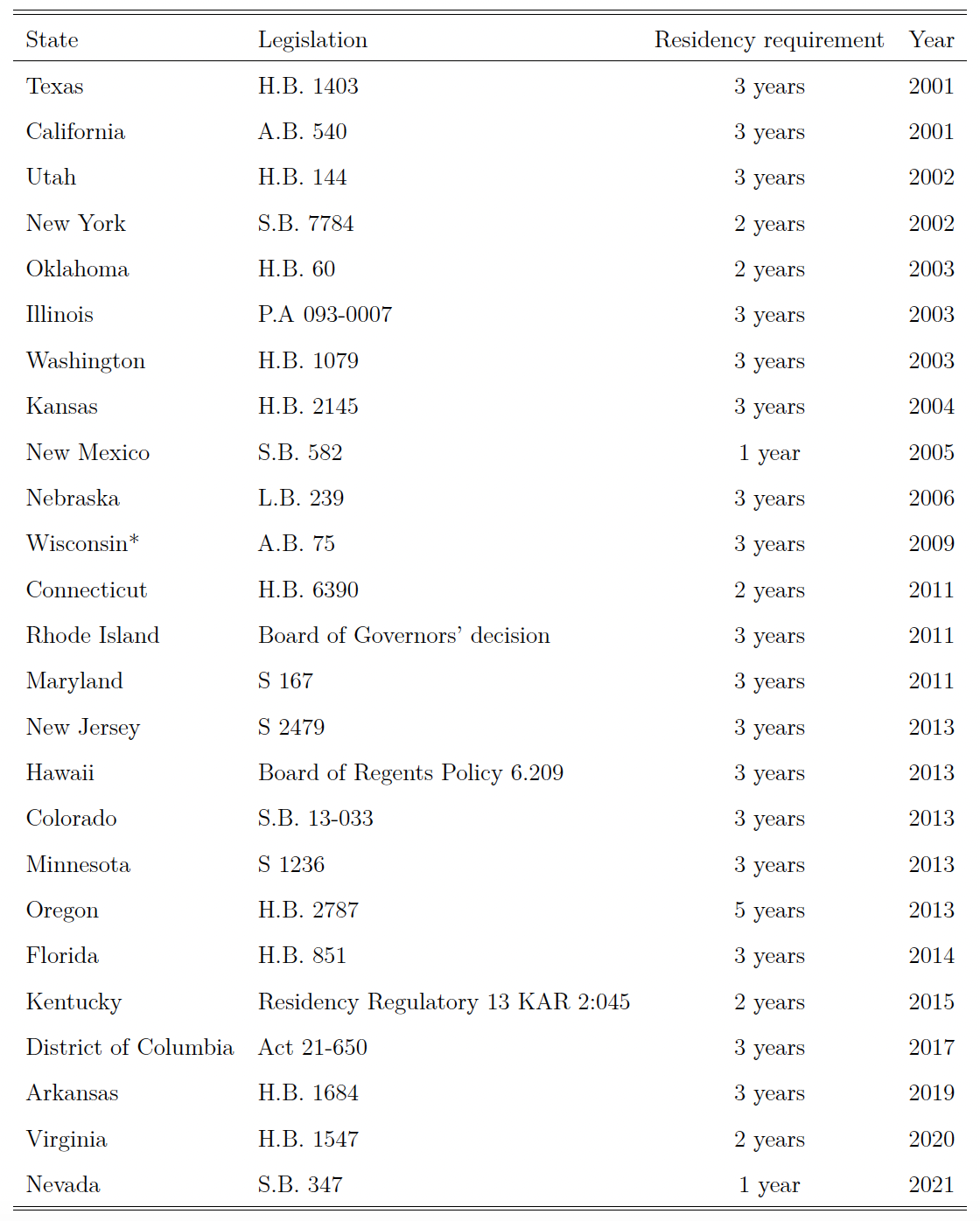 Table A.1: State legislation granting access to in-state tuition