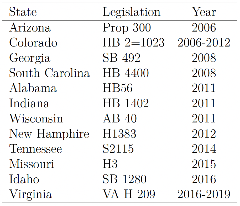 In our third and final specification test, we address concerns over the endogeneity of mobility of immigrants. Policies friendly toward the undocumented population may attract more undocumented immigrants to the state, which would bias our results. Table 11 aims to investigate whether the policy adoption changes the composition of the state’s population, namely its share of the likely undocumented. We again collapse the data at the state-year level, lag the policy by one year, and regress the state’s share of likely undocumented on the policy. The adoption of the policy is not associated with confounding population changes.