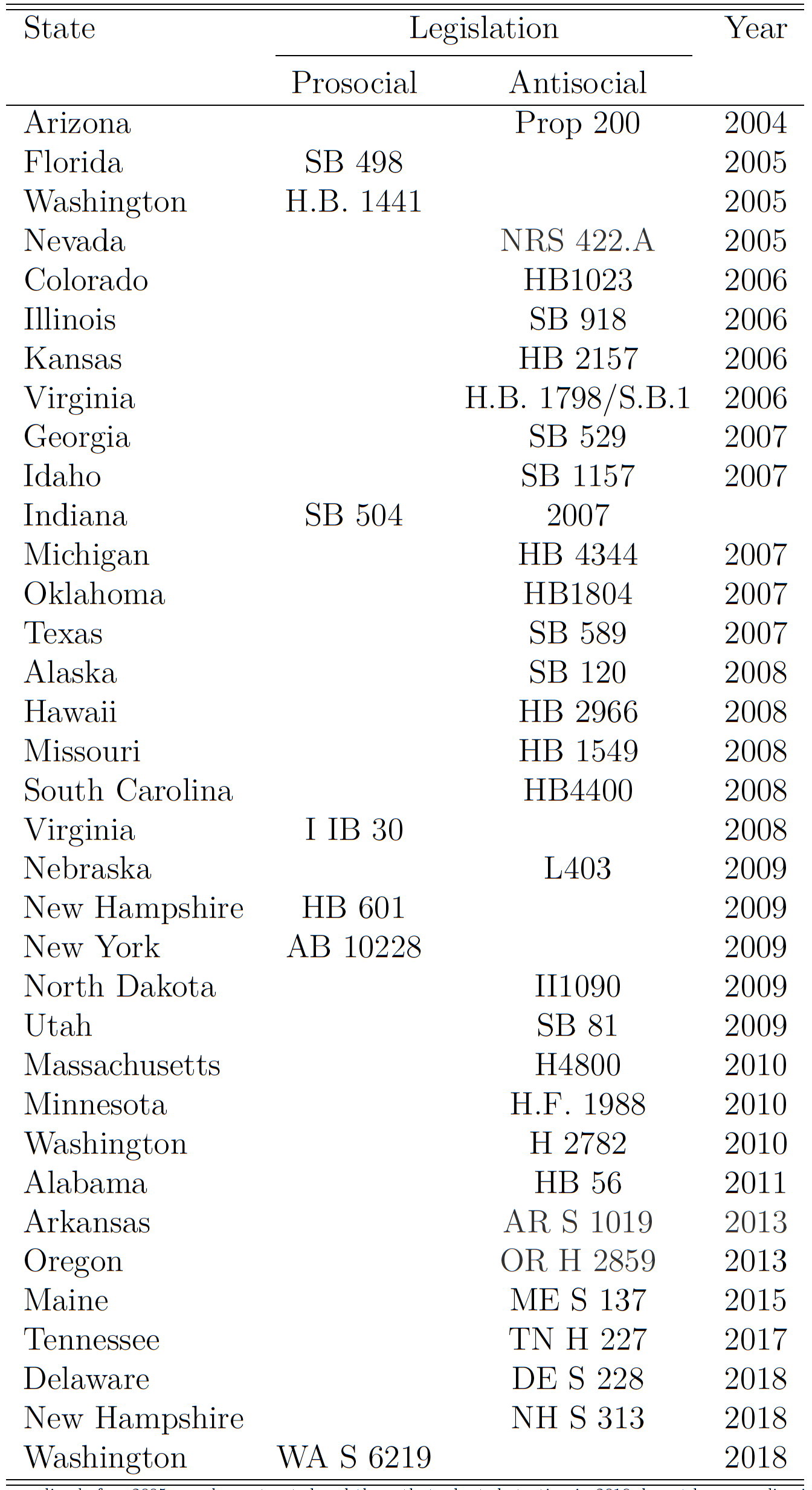 Table A.3: State legislation prohibiting access to in-state tuition (hostile)