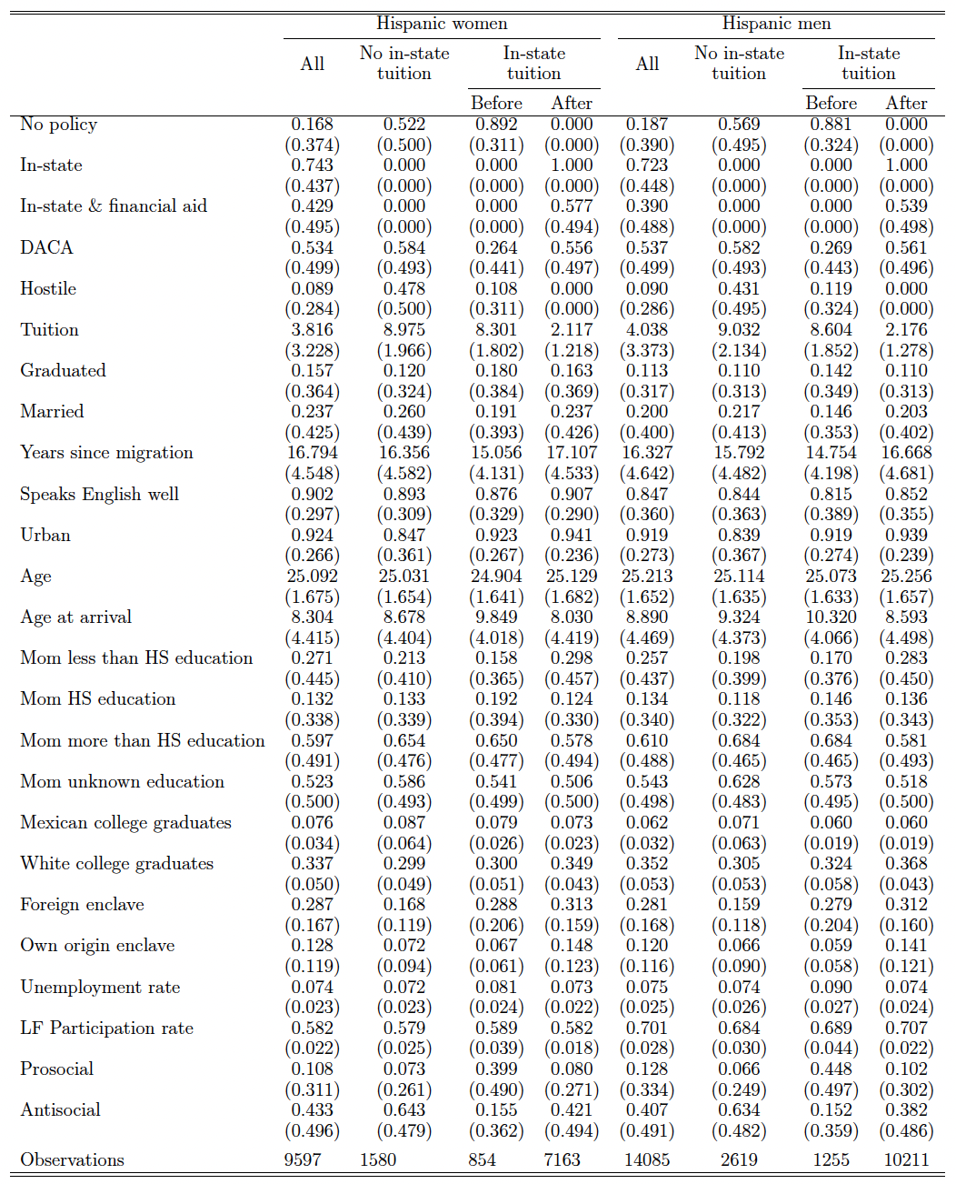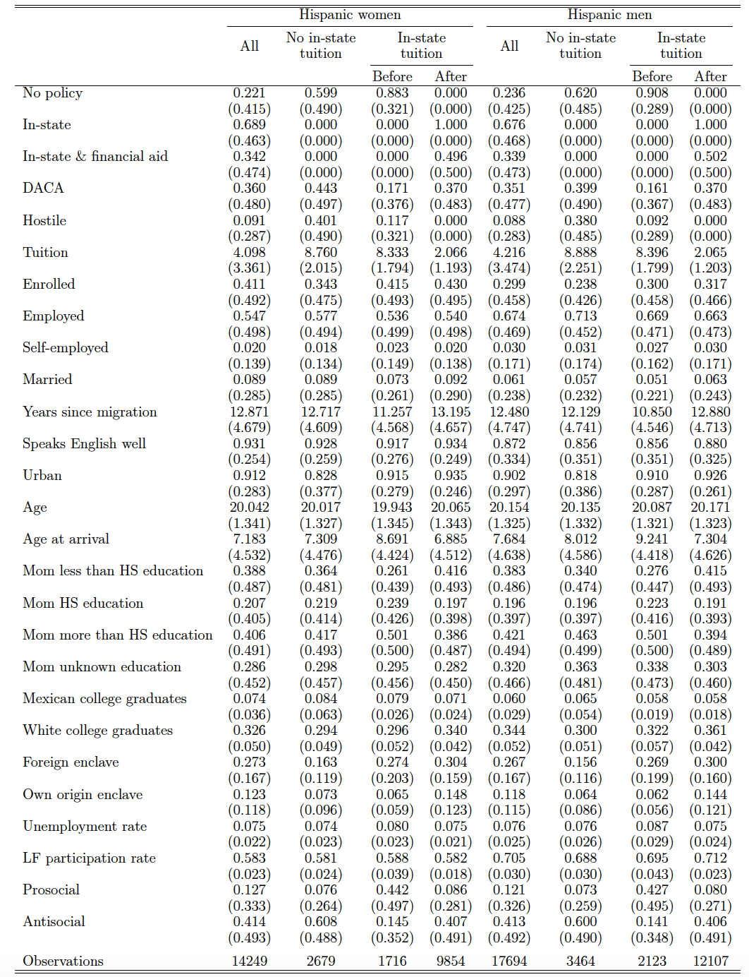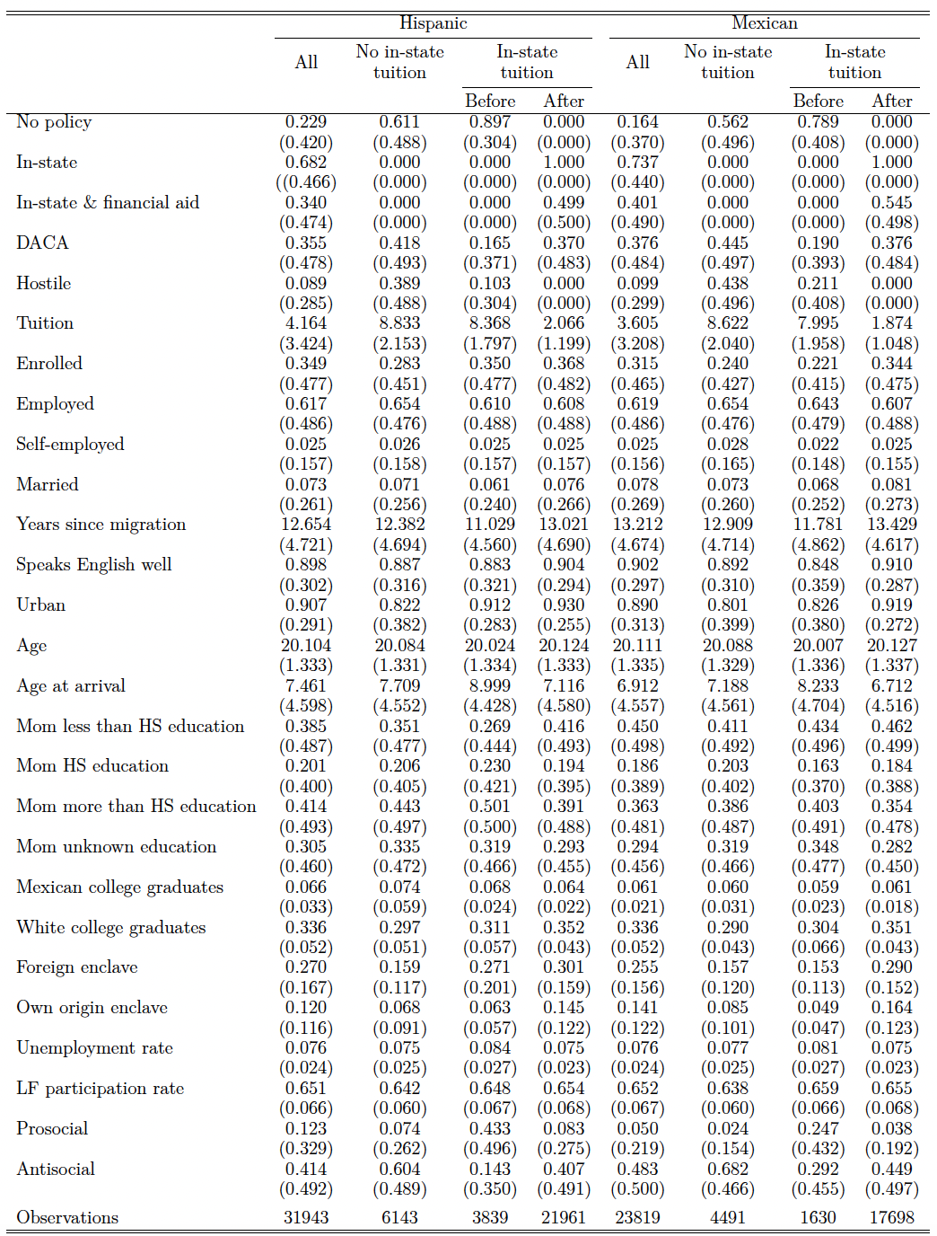 Table 2 provides selected summary statistics. The table presents the means for all the likely undocumented Hispanic noncitizens and for the subsample of individuals from Mexico in two panels. Panel A is restricted to those 18-22 years of age, and Panel B to those 23-28 years of age. Panel A is the main sample used for most of our analysis. Panel B includes older likely undocumented youth to allow us to examine the impact of in-state polices on graduation rates. Within each group we present descriptive statistics for the full sample, and whether the state has an in-state tuition policy. For those residing in states with in-state tuition, we show descriptive statistics before and after the policy change. About 68 percent of our Hispanic sample of 31,943 likely undocumented youth live in states that offer in-state tuition at some point in our analysis while 73.7 percent of 23,819 Mexican youth live in those same states offering in-state tuition. Conditioning on having an in-state policy in place, approximately 34 percent of Hispanic (40 percent of Mexican) undocumented youth live in states that also offer financial aid. In our sample, we identify that about 35-38 percent of the likely undocumented are eligible for DACA. About 9 to 10 percent of each of our samples reported in Panel A (Hispanic and Mexican) live in states that have enacted policies that are hostile to higher education.