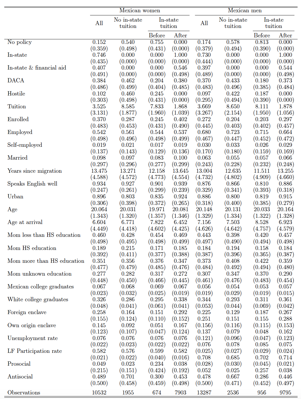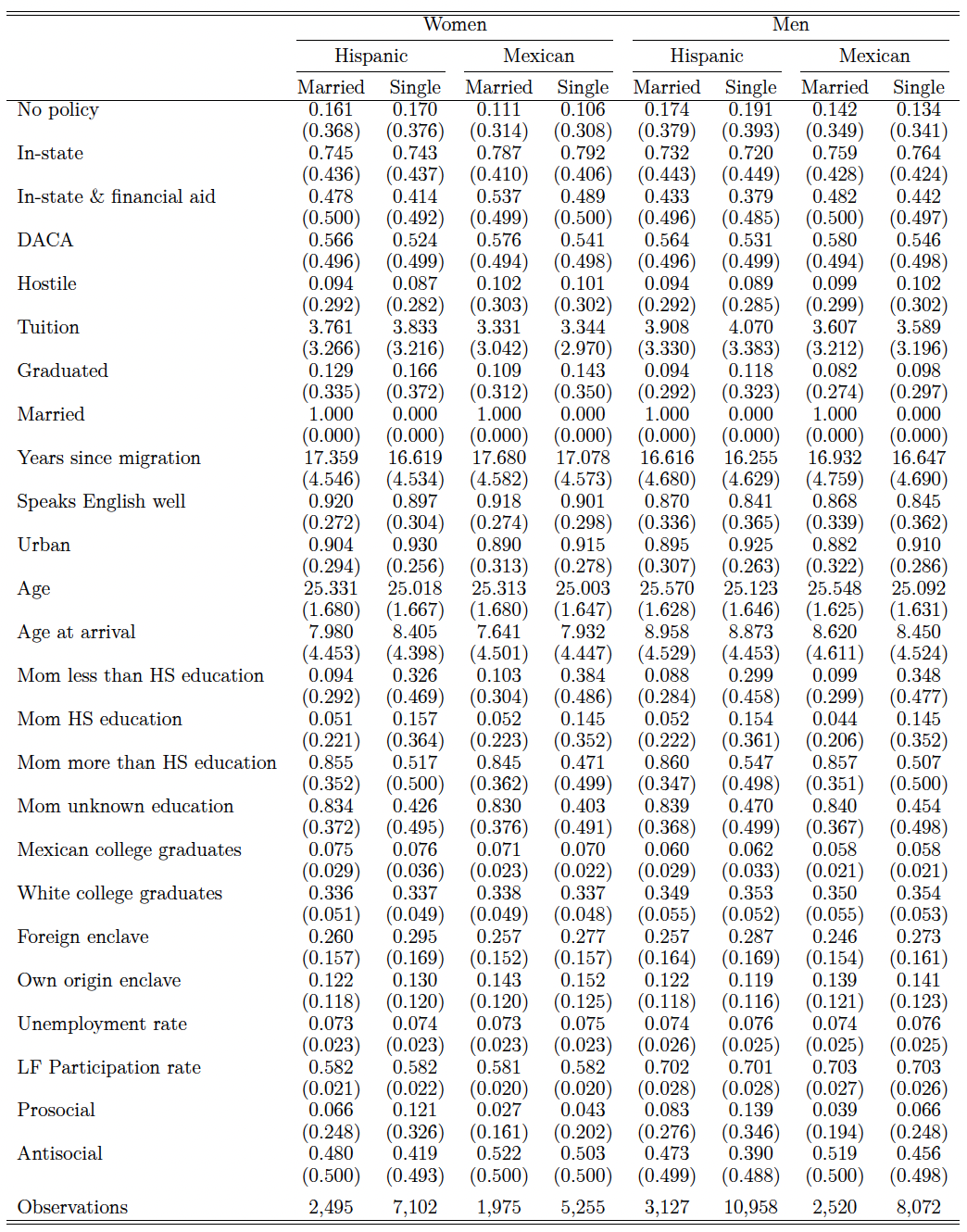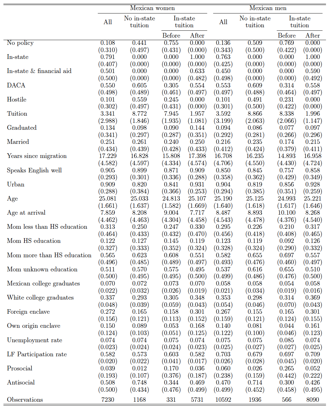 In order to control for the state’s overall environment toward its undocumented population, following Bozick et al. (2016), we also identify policies targeting the undocumented and classify the positive ones, such as access to health care as prosocial, and those that restrict access as antisocial (Appendix Table A.5). Including measures of a state’s prosocial versus antisocial policies addresses the potentially confounding effects of the state’s overall receptivity toward immigrants. In addition, we control for the state’s labor market conditions by computing the annual state-level Hispanic unemployment and labor force participation rates for men and women from the ACS. We also calculate the percentage of Mexican men and women with a college degree for each year to estimate the average propensity of college graduation over time and by gender. Furthermore, we calculate the current proportion of foreign-born individuals and individuals from the same origin country in one’s Public Use Microdata Area (PUMA) to control for the size of ethnic enclaves and information networks.11PUMA is a geographic area of 100,000-200,000 people. While an enclave may increase access to information about college in general, Bergman et al. (2019) find that awareness of tax benefits (similar to our lower tuition) does not change motivation to enroll.