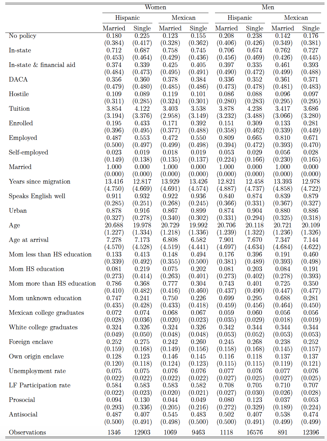 Table A.9: Descriptive statistics, age 18-22 by gender - Mexican