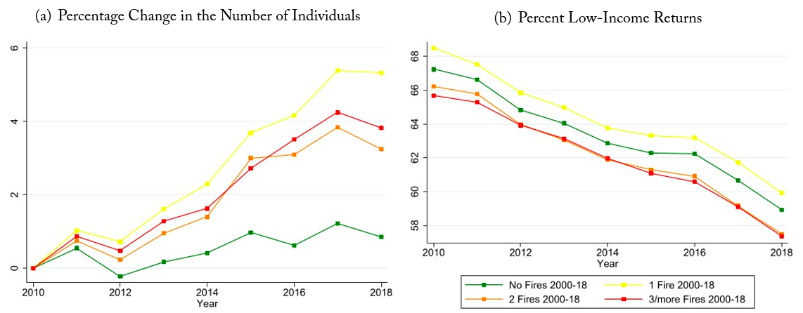Figure 3 shows the mean percentage change in the number of personal exemptions and the percent low-income returns according to how many years a ZIP code was exposed to a wildfire from 2000–18.