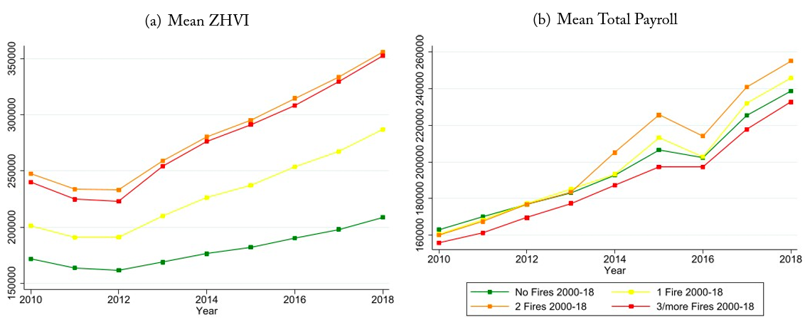 I consider the impact of ZIP code–level wildfire exposure on the value of homes in the ZIP code. To do so, I obtain the Zillow Home Value Index (ZHVI) data. These data provide a smoothed, seasonally adjusted monthly measure of the typical home value in the 35th to 65th percentile at the ZIP code level. I calculate the mean of these data to create an annual series. Note that this index values homes that do or do not sell within a given time period, so it is not exclusively a measure of the value of homes that changed ownership. Figure 4 shows the change in this variable over time. Notably, ZIP codes with more frequent wildfire exposure have higher average home values and have seen a faster increase in their average home values over the period of time of interest. I also obtain a measure of a ZIP code’s annual total payroll from the Census Bureau’s County Business Patterns (CBP). Again, a summary of the mean of this variable is shown in figure 4.