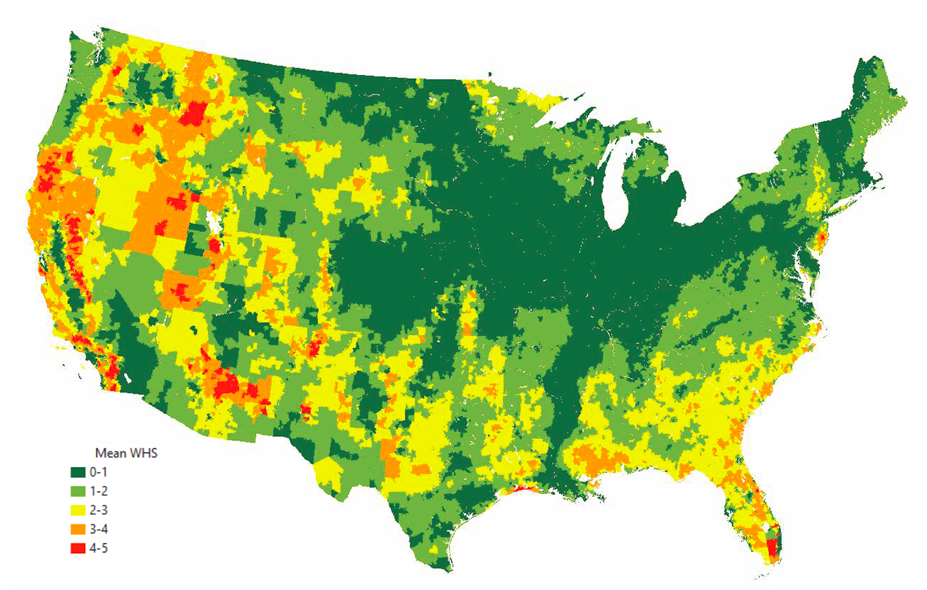 Figure 8 shows the mean wildfire Hazard Potential (WHP) score for each ZIP code. The mean is provided by the USDA Forest Service Fire Modeling Institute’s Wildfire Hazard Data and calculated from the WHP score of each 50 km2 hexagon within a ZIP code.