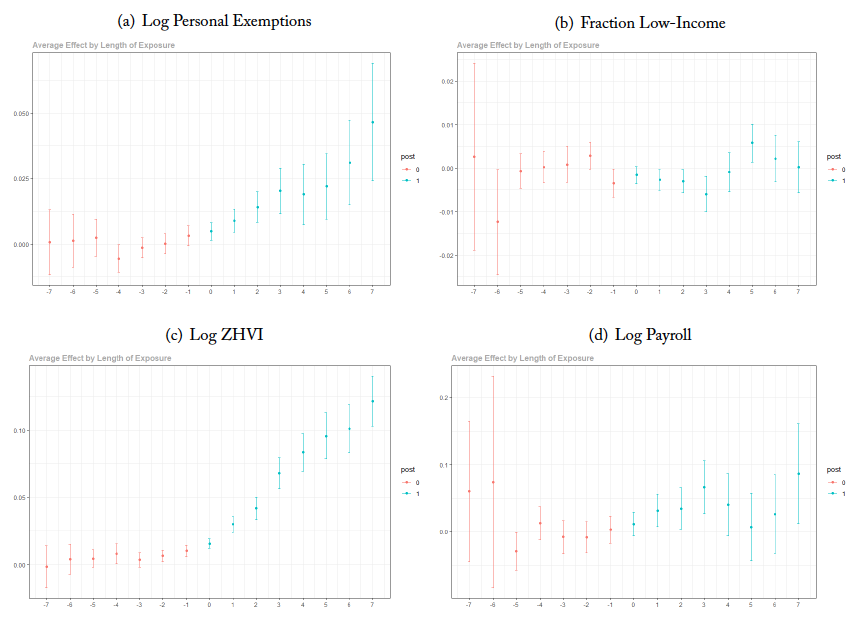 Outcome variable Log Personal Exemptions is weighted according to the ZIP code’s population in 2005. The fraction low income is calculated as the fraction of tax returns filed at below $50,000. Each regression includes ZIP code and year fixed effects.