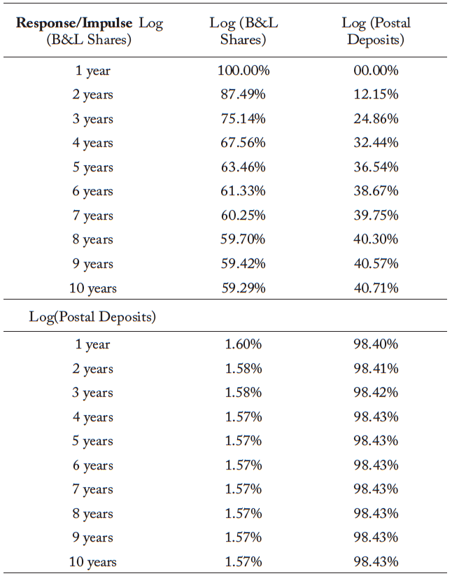 Notes: The table provides the variance decomposition of the panel VAR regression in table 1. The sample contains all towns with at least one active B&L in a particular year. Each observation is a town-year. The two main variables are the natural log of the number of B&L shares and the natural log of the value of postal savings deposits. The regression includes both town and year fixed effects and the log of town population.
