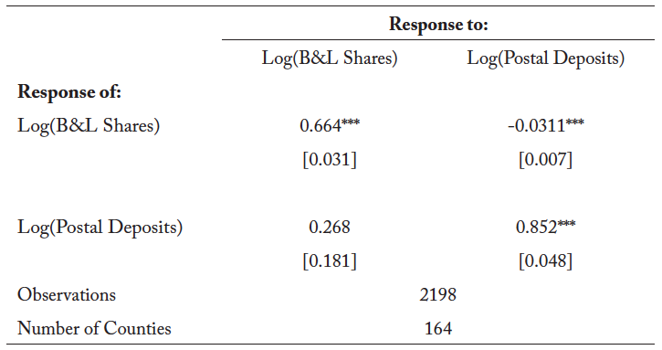 The county-level panel VAR with commercial bank deposits as a control is provided in table 3. The effect of postal savings deposits on B&L shares is reduced compared to table 1 but remains statistically and economically significant. The effect of B&L shares on postal savings deposits remains statistically insignificantly different from zero. While unreported here, the IRFs and variance decompositions are similar to those observed at the town level. We are confident that postal savings banks attracted funds from B&Ls during the Great Depression regardless of the behavior of local commercial banks.