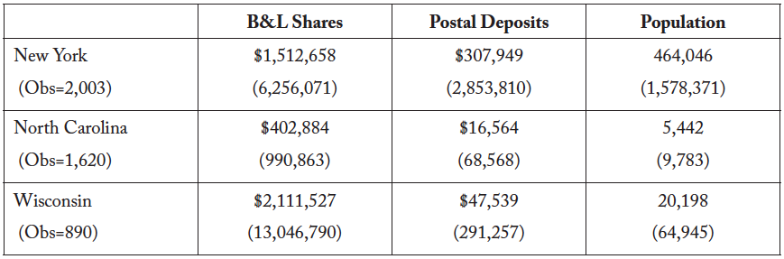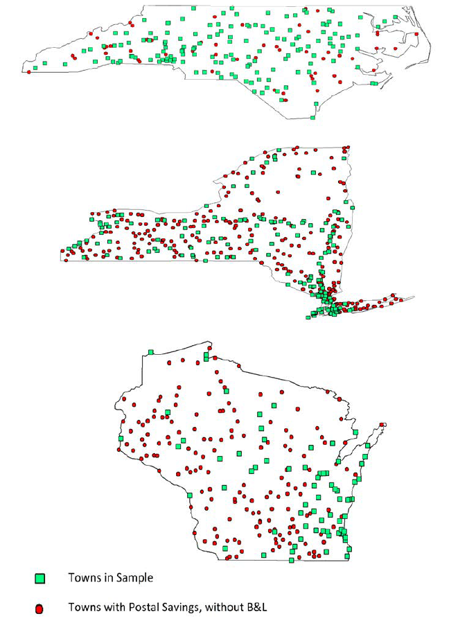 Postal savings data come from Sprick Shuster et al. (2019). The papers’ authors digitized the annual amount of deposits in each post office from the Annual Reports on the Operation of the Postal Savings System. The data on B&Ls come from Fishback et al. (2019). The paper’s authors digitized the name, location, and annual balance sheet of each B&L from the state banking and insurance reports of New York, North Carolina, and Wisconsin between 1920 and 1935.8 See appendix table A.1 for summary statistics on each state. While Fishback et al. (2019) have data for Iowa and Fleitas et al. (2018) have data for New Jersey, we do not include those data here because information is missing for the 1920s. B&L data were aggregated up to the town/village/ hamlet level to match the postal-deposit data. We measure depositor activity in B&Ls by the value of all outstanding shares9There is heterogeneity across the three states in the way they present the information on B&L balance sheets. Fishback et al. (2019) create categories of balance sheet variables that are standardized across states. We use the “shares” category, which includes installment shares and other balance sheet categories that reflect deposits, such as paid-up shares, income shares, and one-payment shares. and depositor activity in postal savings banks by total deposits. Our sample stops in 1935 in order to avoid the confounding effects of the conversion of B&Ls into S&Ls and governmental policies implemented to directly assist B&Ls in the second half of the thirties.