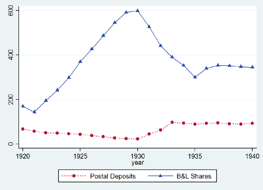 Regulatory competition is often blamed for causing financial crises. For example, studies have highlighted the instigating role of trust companies in the Panic of 1907 (Moen and Tallman 1992), saving and loans associations (S&Ls) in the S&L crisis (Shoven et al. 1992), and shadow banks in the Great Recession (Gertler and Gilchrist 2018). Typically, this outcome occurs due to the attraction of funds to less regulated and more risky financial institutions that offer a high return. However, regulatory competition also worsens financial crises when they do occur as investors often shift funds into commodities such as gold, which extends runs on institutions, and as commercial banks accumulate reserves at the Fed, which prevents funds from being put to use in the community. This paper examines whether this dynamic could partially be responsible for the slow rebound of the mortgage market during the Great Depression. O’Hara and Easley (1979) blame the federally insured US Postal Savings System for attracting needed funds from building and loan associations (B&Ls) during the 1930s, which prevented them from supporting the mortgage market. O’Hara and Easley show a negative correlation between B&Ls and postal savings at the national level, but lacking disaggregated data, they are not able to rule out alternative explanations and reverse causality. In this paper, we use annual town-level data from 1920 to 1935 on both B&Ls and postal savings depositories to formally test this relationship by comparing changes in deposits in institutions in the same location during the same year.