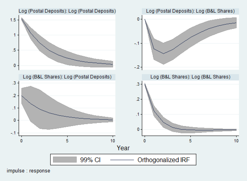 Figure 3 shows the IRFs for our system of equations which estimates the effect of a positive one-standard-deviation shock to each of the endogenous variables on both itself and the other endogenous variable.15Note that the IRFs should be interpreted as disturbances to the equilibrium. Therefore, a shock in any year will disturb the system from the existing equilibrium to a new equilibrium. We assume that the parameters describing the equilibrium are the same during the whole period of estimation and during the next years that are implied by the IRFs. Therefore, the IRFs are counterfactuals that allow us to understand the average effects over the whole period of the sample. The IRFs imply that such a shock to the log of postal savings leads to a 0.1-point decrease in the log of total B&L share value that persists for several years: the 99 percent confidence interval does not include zero until almost eight years following the initial shock. The persistence of the estimated effect signals that the decline in B&L share value as a result of the postal savings shock is likely to have been a semi-permanent fixture rather than a temporary deviation from a steady state. The IRFs also indicate that a positive shock to B&L share value has a positive effect on postal deposits in the contemporaneous period but the effect becomes insignificant after one period. This finding of a positive contemporaneous effect of B&Ls on postal deposits stems entirely from the assigned Cholesky ordering: when we switch the ordering, the IRF shows B&Ls to have no effect on postal deposits in any period.