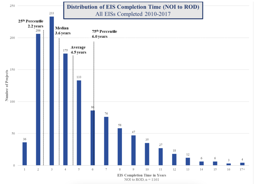 Litigation is not the norm. Many EIS documents move through the process without unconscionable delays and without drawing a lawsuit. CEQ’s completion time data shows that most EISs are completed within 4 years. One in 4 EISs, however, takes at least 6 years to complete. The long tail of the distribution extends far to the right, with four EISs taking more than 17 years to complete, and because the CEQ data includes only completed EISs, the data necessarily exclude EISs that have been delayed so long that they have yet to conclude.14 “Environmental Impact Statement Timelines (2010–2017).”