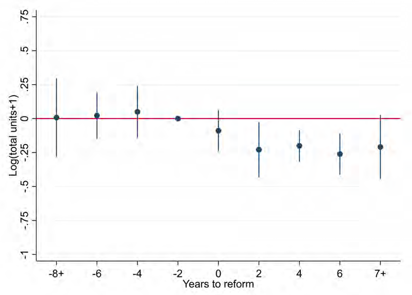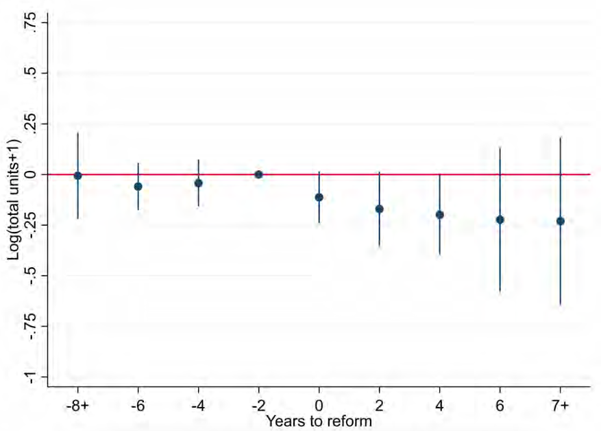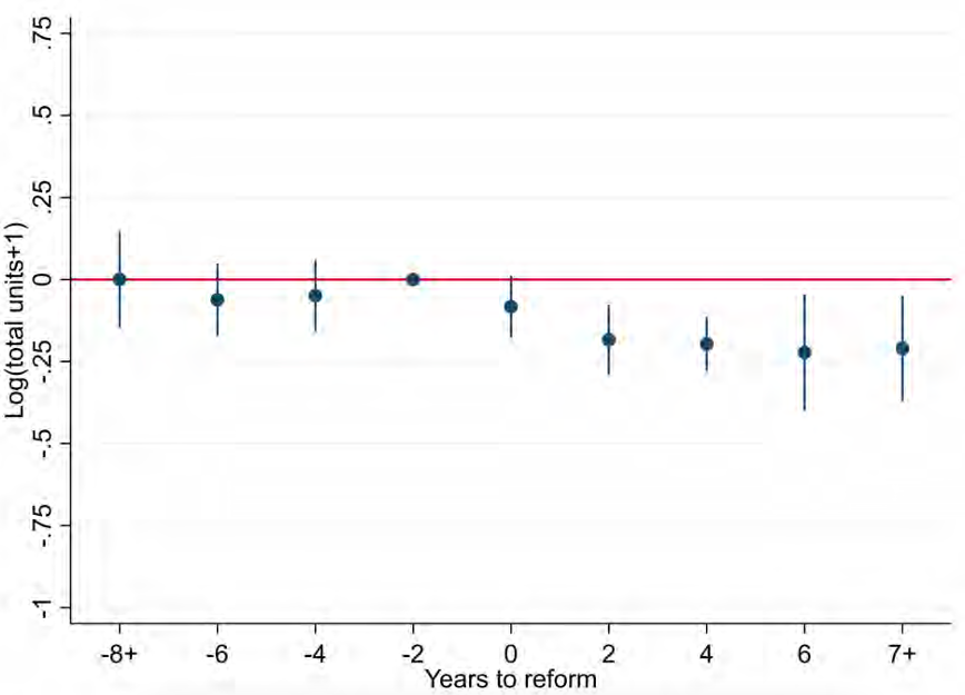 The difference-in-differences results shown in Panel A of Table 2 approximate the average effect of decentralization over the seven years after the reform. The after-treatment coefficient is -0.236 (S.E. = 0.059, p<0.01) when using all units as the outcome variable, suggesting that reforms reduced housing permits by over 20%.17Appendix Table A.2 shows estimates of the effect on total units under tweaks to the specification. In Columns 1 and 2, neither using the inverse hyperbolic sine to construct the dependent variable nor removing the restriction on the number of post-treatment years affects results. Because reforms may take time to pass, leading to an effect before their official approval, I drop the treatment year and the prior year in Column 3 and find little change. Finally, in Column 4, including time-varying controls for population, percent white, and percent owner-occupied makes little difference.
