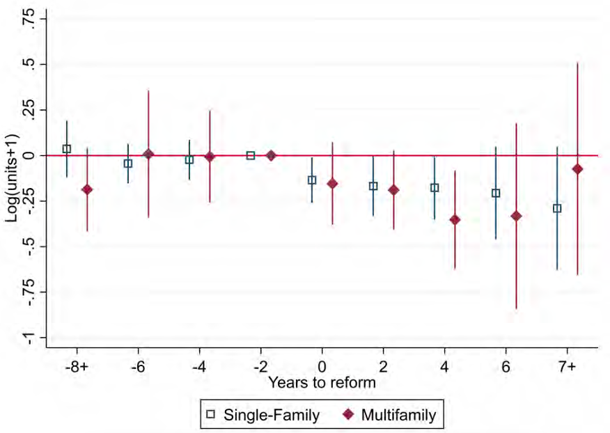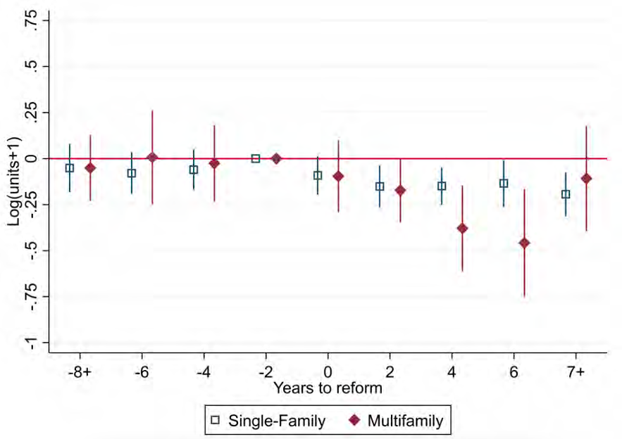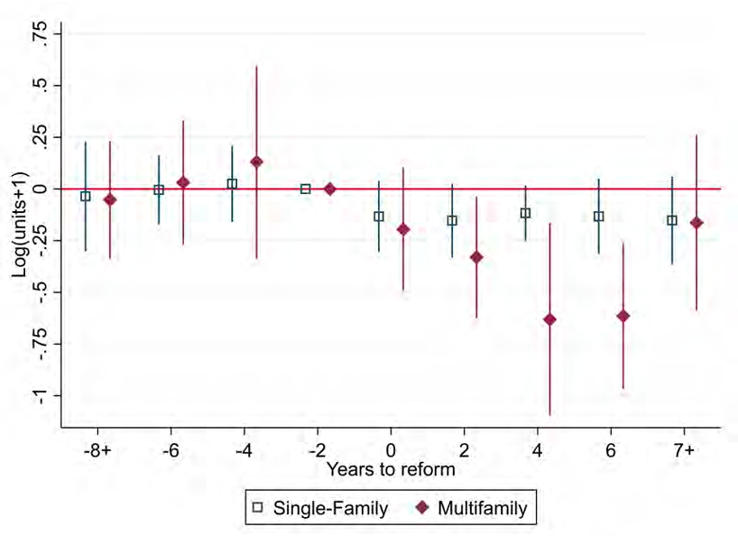 Baseline event study results for log housing units permitted plus one are shown in Figure 1. Pre-trends appear to be minimal, suggesting that at-large towns serve as an effective control group despite being different on some characteristics. However, there is a stark change following the reform’s approval, with housing permits falling in treated towns. The effect appears to begin immediately in the treatment year and reach a stable level by two years later, where it remains until the end of the sample. Figure 2 repeats the event study specification separately for single-family and multi-family units. While the pattern of parallel pre-trends followed by a sharp decline is the same for both outcomes, the effect is much larger for multi-family units. In addition, for multi-family units, the effect is less stable in the post-period, perhaps because the lumpy nature of multi-family buildings creates more noise.