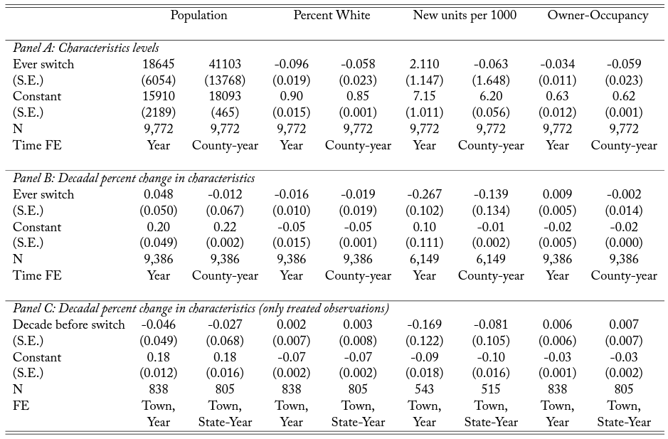 In Panel A, I regress several characteristics on an indicator for whether a town ever switches, and, depending on the specification, either county-year or year fixed effects.15Appendix Table A.1 shows raw characteristics for treatment and control towns in the pre-period. Because characteristics are only observed in the decennial census years, I include only those years in the sample, and I drop post-reform observations in treated towns to avoid conflating baseline differences and the treatment effect. Towns that switch are significantly larger and less white on average, which makes sense given that reforms are often motivated by concerns about under-representation of non-white populations, implying that switching towns must have some presence of these groups. However, the difference in housing units permitted per capita is near zero when including county-year effects, and the difference in the rate of homeownership is only 6% on a base of 62%. This similarity in housing markets fits with anecdotal evidence that reforms are typically not driven by housing concerns.