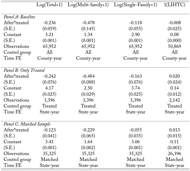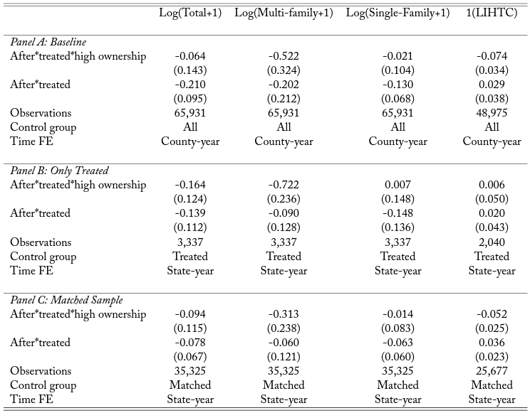 Finally, Column 4 of Table 3 shows results for LIHTC permits. Interestingly, the null average effect found in the previous section appears to be composed of very different effects in low- and high-ownership places. In the baseline specification, the average effect is a statistically insignificant 0.029, and the interaction term is -0.074 (S.E. = 0.034, p<0.035). These sum to a total effect of -0.045 (S.E. = 0.018, p=0.02) for high-ownership towns. Similarly, in the matched specification, the average effect is positive but only marginally significant, while the interaction term is -0.052 (S.E. = 0.025, p=0.048). In contrast, both coefficients are near zero in the only-treated specification.
