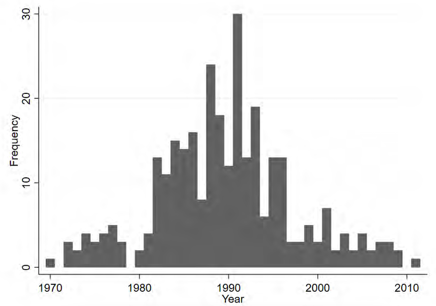 To identify changes from at-large to ward voting, I use the survey question that asks whether a town made this change in the past five years, and, if so, when the reform was approved.11The 1981 survey asks about reforms between 1970 and 1981, expanding the observation window. Across seven waves of the survey (from 1981 to 2011), this identifies nearly 300 municipalities that switched from at-large to purely ward elections at some point between 1970 and 2011. These switches occur across all decades, with 112 and 103 in the 1980s and 1990s and 21 and 30 in the 1970s and 2000s. Appendix Figure A.1 shows the full distribution across years.