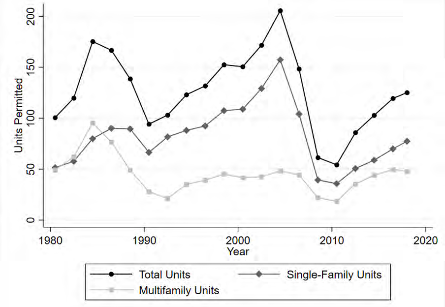 b. Census Building Permit Data: Census Place-level data on new housing permits comes from the 1980 to 2018 waves of the Census Bureau Building Permit Survey. Each year, the Census Bureau surveys about 20,000 permit-granting local governments that represent 98% of U.S. housing production. The Census’s follow-up surveys show that almost all permitted units are eventually built, making the permits a reasonable measure of housing construction. The data includes both the total number of units permitted and the number permitted in single-family and multi-family structures.12The Census imputes values in the event that a town does not respond to the survey, but I drop these observations from the sample. Appendix Figure A.2 shows the time series of units permitted, which is highly correlated with the business cycle, as expected.