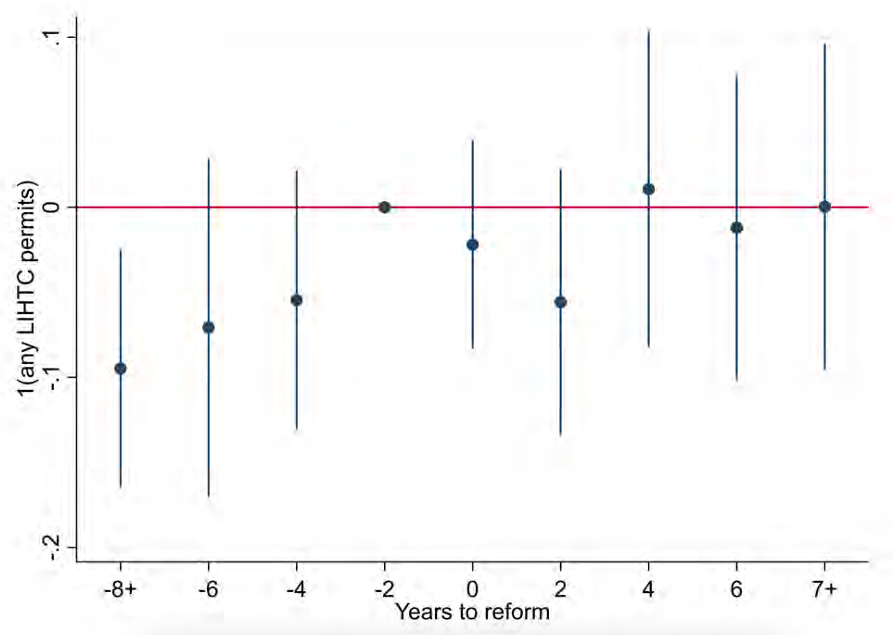 Next, I turn to LIHTC permits. Column 4 of Panel A of Table 2 shows the baseline effect on the probability that any LIHTC units are permitted, which is less than a tenth of a percent. The underlying event study plot, shown in Appendix Figure A.3, does not suggest that this null average effect masks any interesting time trends. However, as discussed below in Section 4.3, there is important heterogeneity across towns underlying the overall effect.