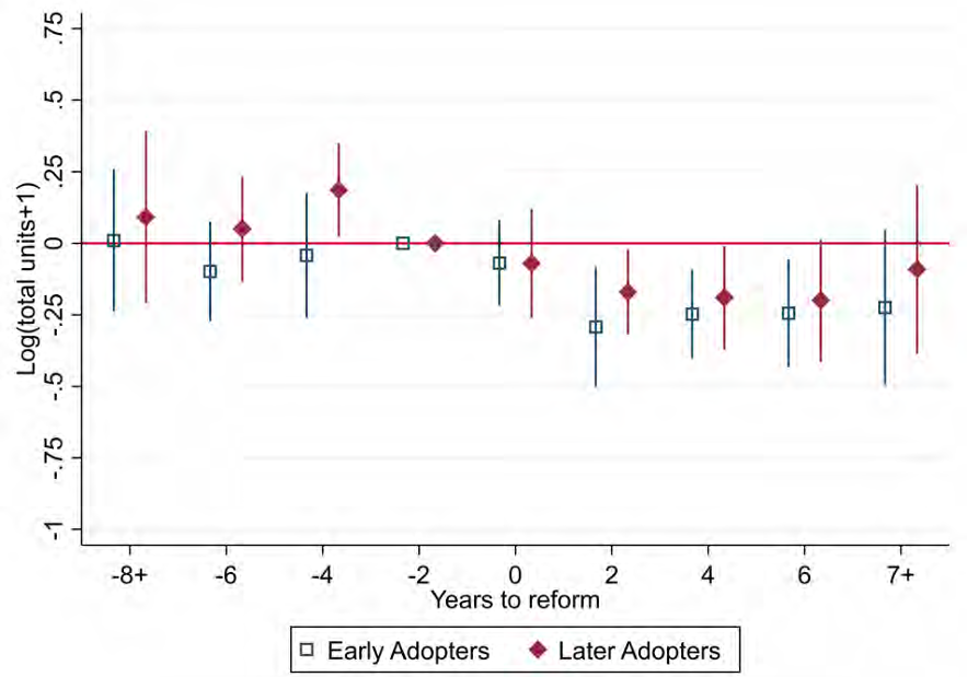Note: This figure shows event study coefficients from two separate estimations of Equation 1. The coefficients labeled Early Adopters are from an estimation including only towns that reformed prior to 1995 in the treatment group. The Late Adopters estimation includes only towns that reformed after 1986. The specifications are otherwise identical to the baseline.