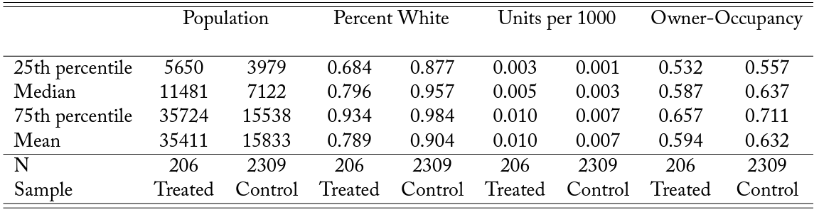 Alternatively, over a longer time period, a ward-elected council could set non-housing policies that make a town less attractive to developers. But the timing again does not support this story—the effect of the reform occurs immediately, before these policy changes could be implemented and pass through to construction. In addition, Appendix Table A.4 repeats the main difference-in-differences specifications using other town characteristics as the dependent variable. Across the three specifications and three dependent variables, only one estimate is statistically significant. This is inconsistent with large indirect effects of the reform that pass through to housing markets. Similarly, Column 3 of Appendix Table A.2 shows estimates of the effect on total units with added controls for time-varying town characteristics (percent white, percent owner occupancy, and population). The coefficients of interest are similar to the baseline specification, suggesting that indirect effects of reforms cannot explain the housing production result.