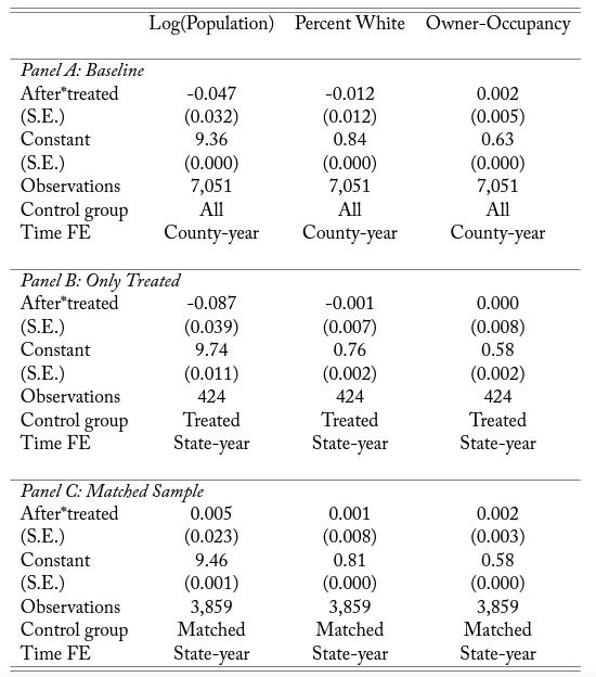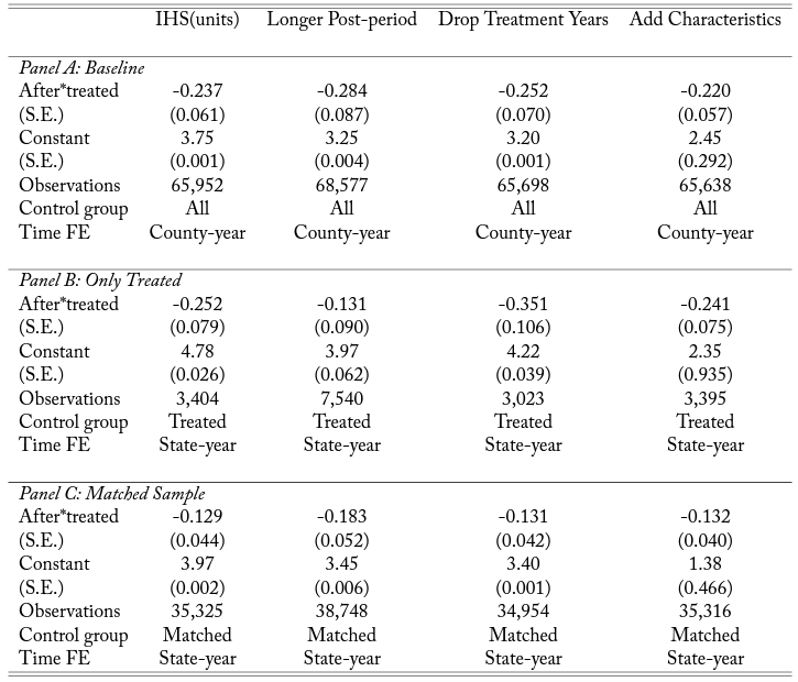Note: This table shows results from the difference-in-differences specification in Equation 2. The column heading denotes the dependent variable. Panel A represents the baseline specifications, which includes the full analysis sample. Panel B includes only observations that are treated at some point in the sample period, while Panel C restricts to the matched sample described in Section 3.3. The specifications include town fixed effects and the time fixed effects indicated in each panel. Errors are clustered at the state level.