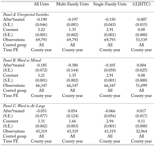 Results from alternative specifications support the baseline estimates. The DiD estimates are extremely similar when including only treated towns (Table 2, Panel B), and the corresponding event studies (Appendix Figures A.4 and A.5) also change minimally. When using a matched control group, estimates are smaller but tell a similar story (Panel C of Table 2, Appendix Figures A.6 and A.7). Total units decline by 12.3% (S.E. = 0.041, p=.06) and multi-family units decline by 22.9% (S.E. = 0.065, p<0.01). The effect on single-family units is negative but not statistically significant.18In addition to alternative specifications, I consider alternative treatment definitions in Appendix Table A.3. First, I include towns that report an at-large council in one survey wave and ward in the next but do not explicitly report a reform, setting the treatment year to the midpoint of the gap between their survey responses. As shown in Panel A, the treatment effect shrinks, perhaps reflecting measurement error in the new definition, but remains negative and statistically significant. Panel B expands the treatment definition to include at-large to mixed switches, which again slightly shrinks estimates. Finally, Panel C defines the treatment as reporting a ward system in one wave and an at-large in the next. All coefficients are near zero, suggesting that government disruption associated with a reform of any type does not drive the main results.