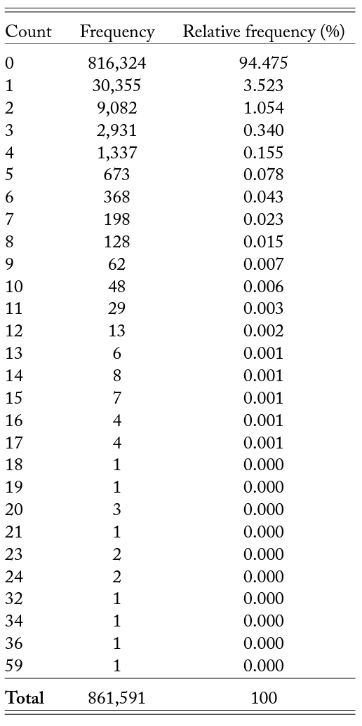 Table A2. Roadkill: Actual Frequency Distribution, 2010–2021