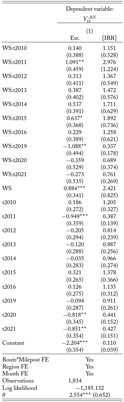 Note: The dependent variable is the count of monthly roadkill per month for each mile on each road. Columns 1–4 are the analyses with the full sample. All regressions follow a negative binomial distribution. Column 1 reports results with no fixed effects, and column 2 reports results from adding month fixed effects. Column 3 reports results from adding month and region fixed effects, and column 4 reports results from adding the full set of fixed effects including month, region, and route by milepost fixed effects. The coefficient estimate for the WS in column 4 is very large and thus omitted in reporting. ∗p<0.1; ∗∗p<0.05; ∗∗∗p<0.01
